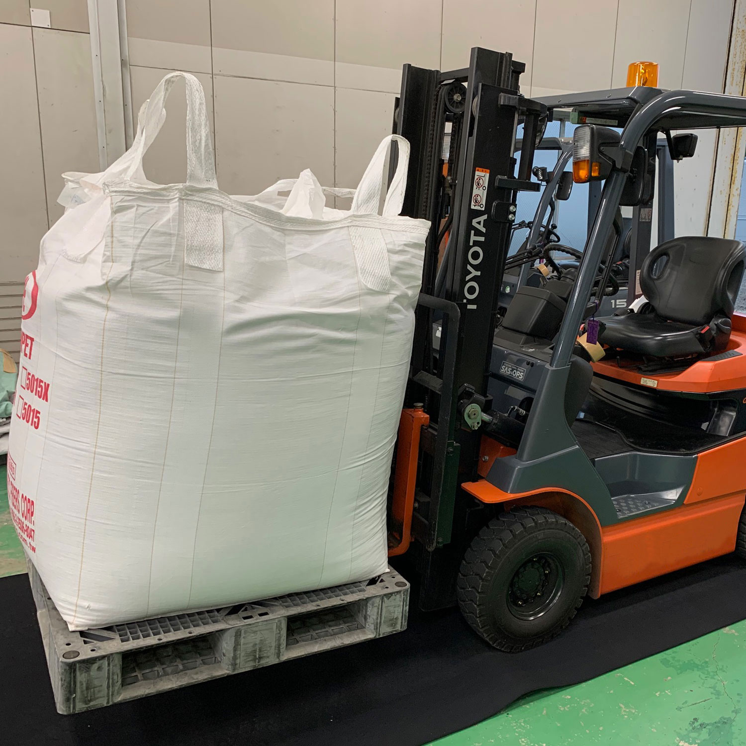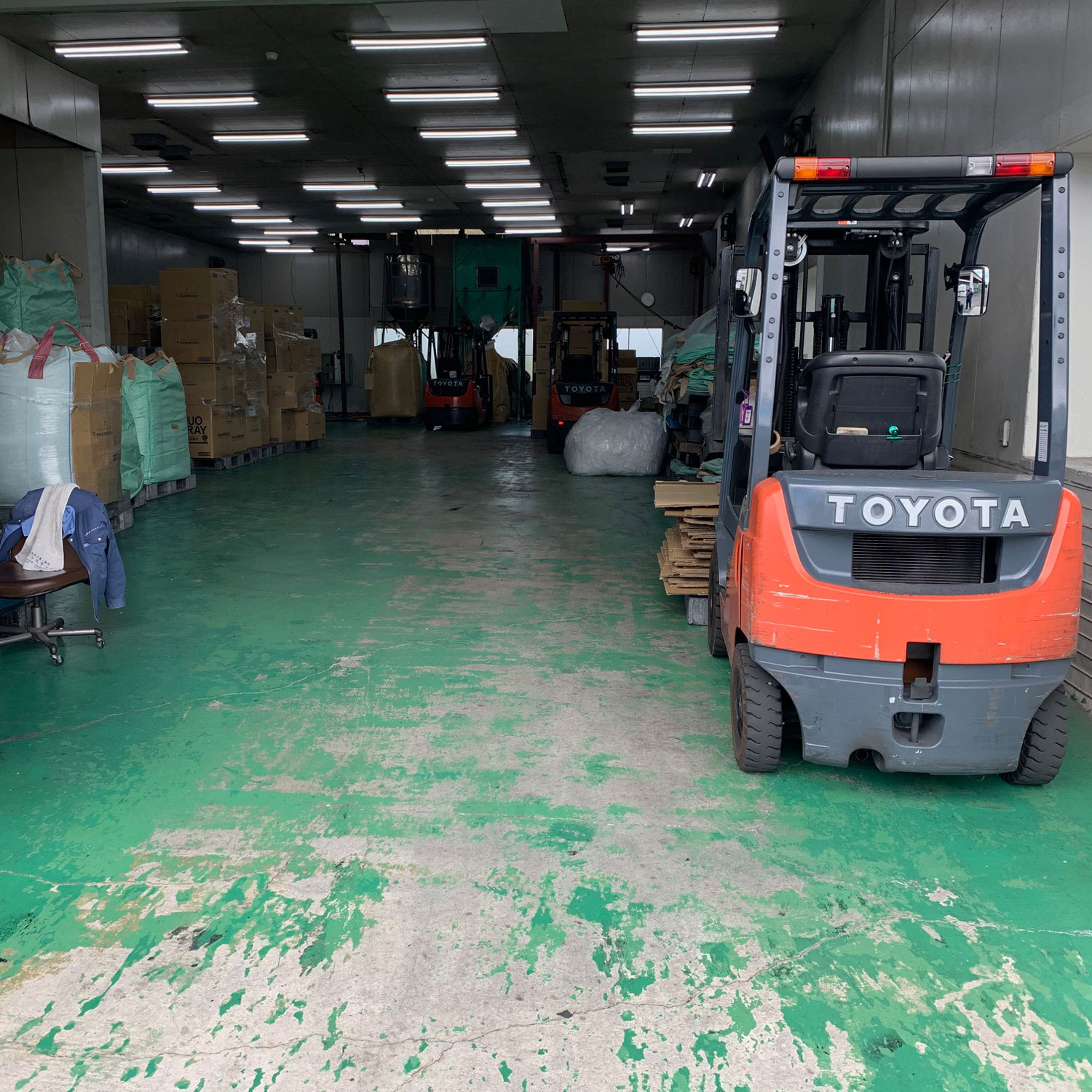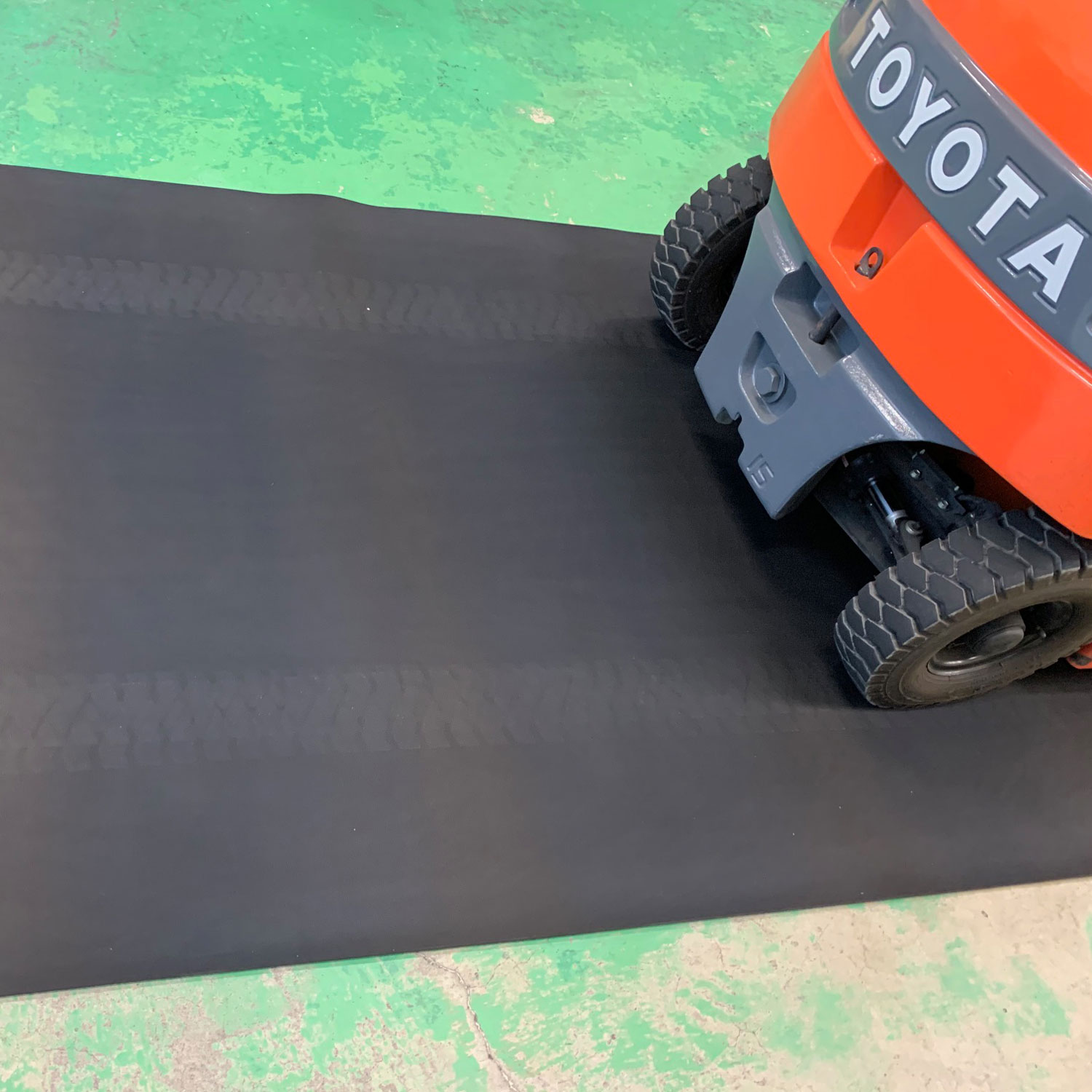 工場内出入り口付近で雨がかかるので、フォークリフトの滑り止めにゴムマットを使っていただきました。
