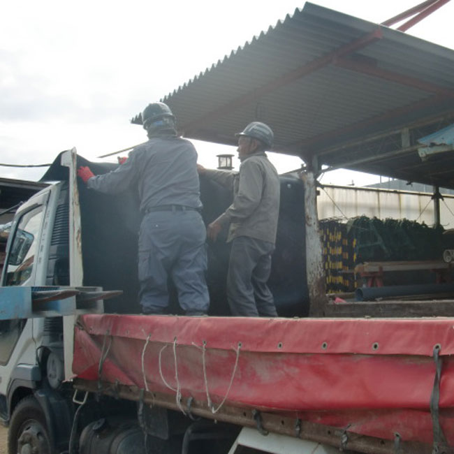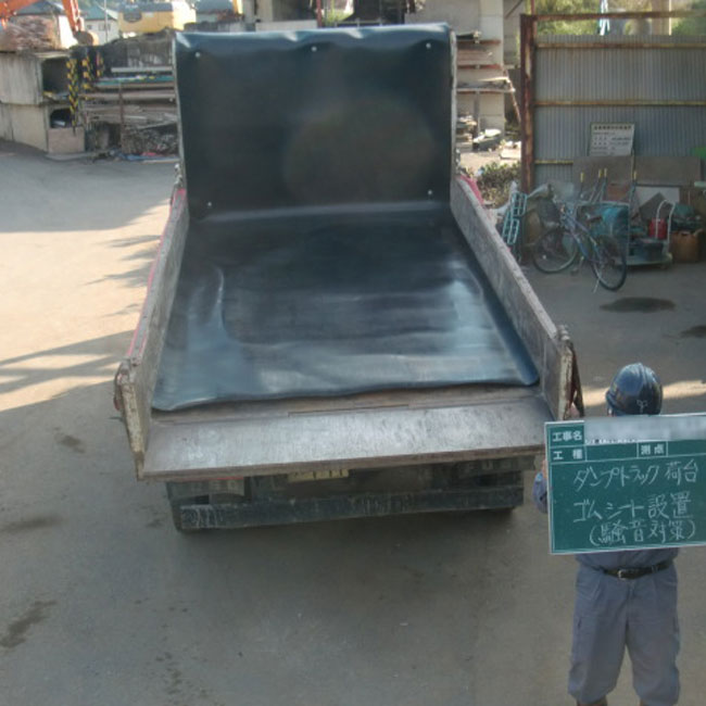 近隣住民への騒音防止策として、ダンプの荷台にゴムマットを敷いていただきました。
