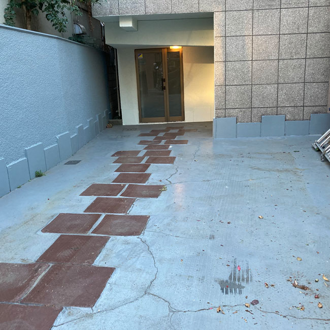 ▽ 敷く前の状態です。コンクリートが割れた破片が見えますね。