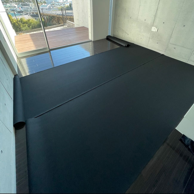 パーソナルトレーニングジム内に人工芝をそのまま敷くとズレる恐れがあるためゴムシートを敷いていただきました。ズレ防止だけではなく、養生(キズ防止)、防音、防振の役割も果たせるかと思います。合成ゴム(両面エンボス)はゴムの臭いがほぼしないので、室内でも臭いを気にすることなくお使いいただけます。