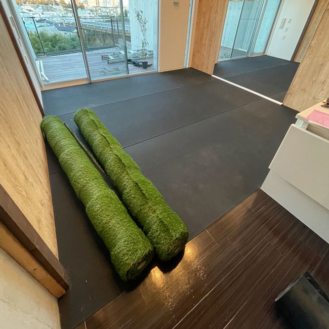 パーソナルトレーニングジム内に人工芝を敷かれる際のズレ防止、床面養生にゴムマットを使っていただきました。