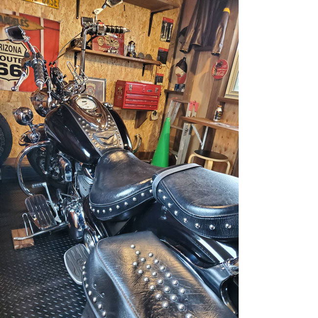 お写真を送っていただきました。バイク及びガレージがかっこよい雰囲気で驚きました。様々な道具が置かれていますが、全体の調和が取られていてガレージ内の雰囲気が統一されています。