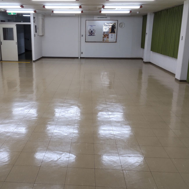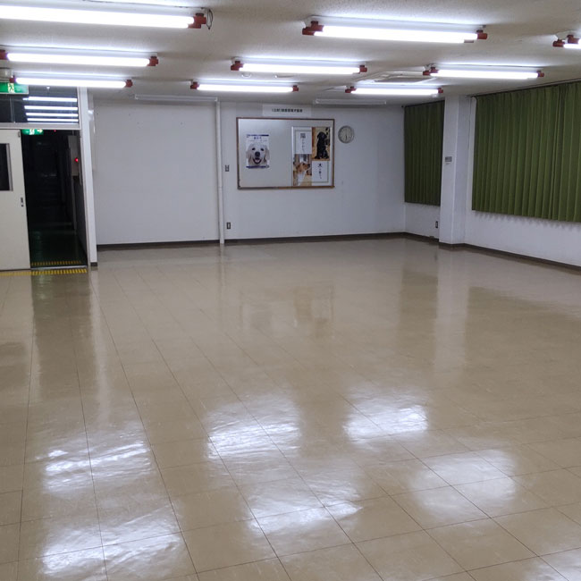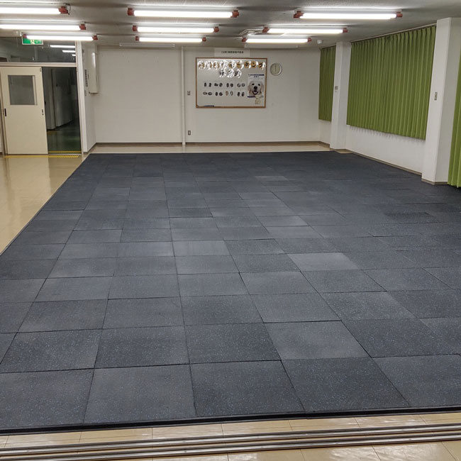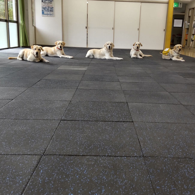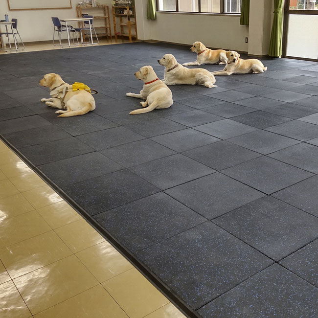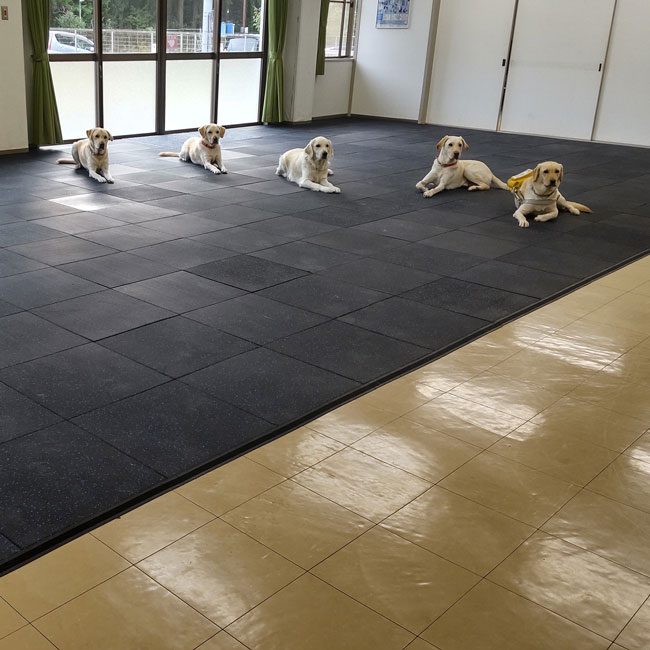 公益財団法人関西盲導犬協会がたくさん集まるホール内の滑り止めおよび床面養生目的でスポーツジム専用ゴムをお使いいただきました。