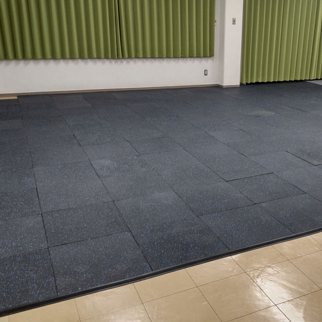 盲導犬用ゴムマットはありませんが、フロア内(ホール内)の滑り止め、養生目的でしたらスポーツジム専用ゴムマットがオススメです。臭いがしない、1枚重量が軽いの持ち運びしやすい、ゴムチップ系でクッション性に優れるが表面に薄いゴムを1枚敷いているのでチップがバラバラになりにくい、厚さ15mmタイプは防炎認定品などがオススメの理由です。
