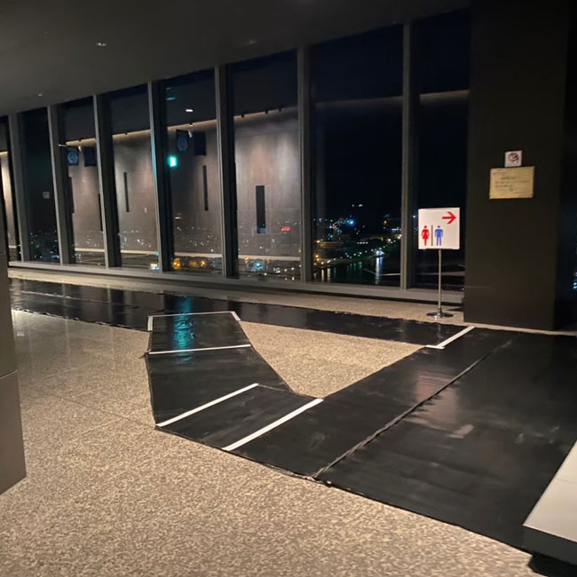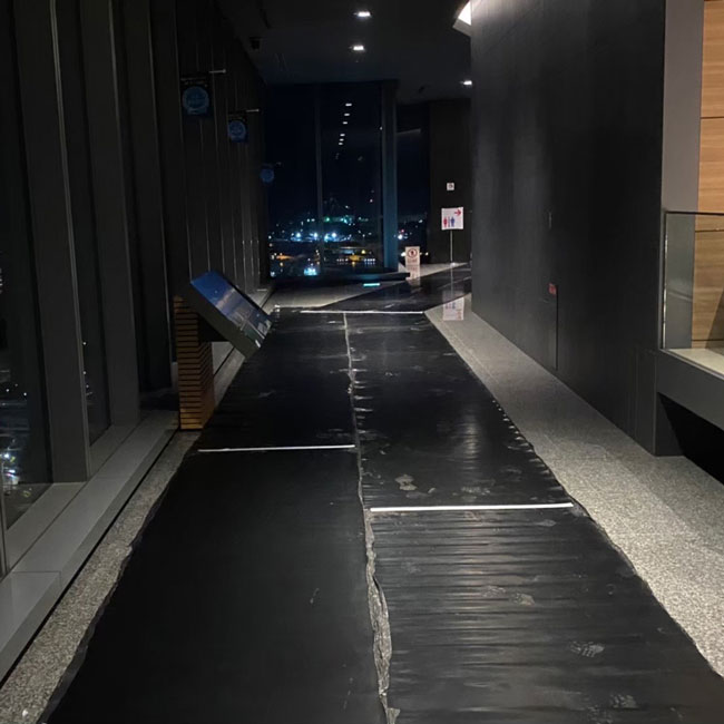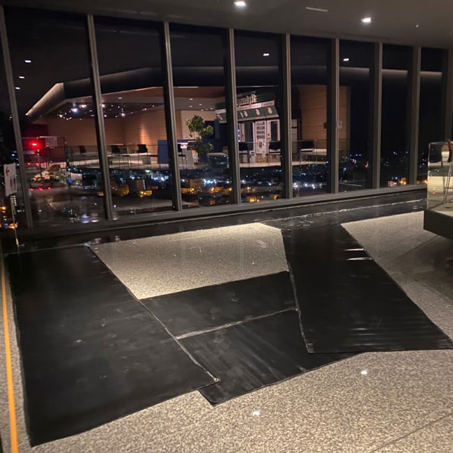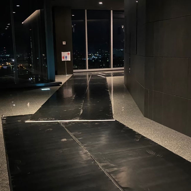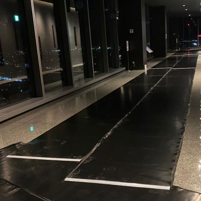 夜間、館内工事をするにあたって歩行路、運搬路の床面養生に天然ゴムシートを敷いていただきました。