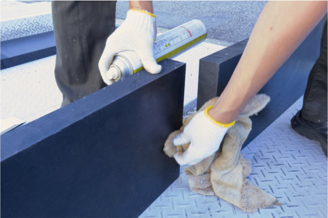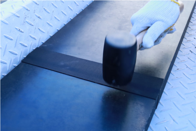 今回は、厚さ50mmのかさ上げゴムをお買い上げいただきました。厚さ40mm以上の商品には、先頭パーツにテーパー(斜面)加工を施しております。また、かなりの重量になるためパーツごとの長さは1Mを限度としています。ズレを防止するために各パーツを連結できる「ジョイントテープ」もセットでお付けしています。