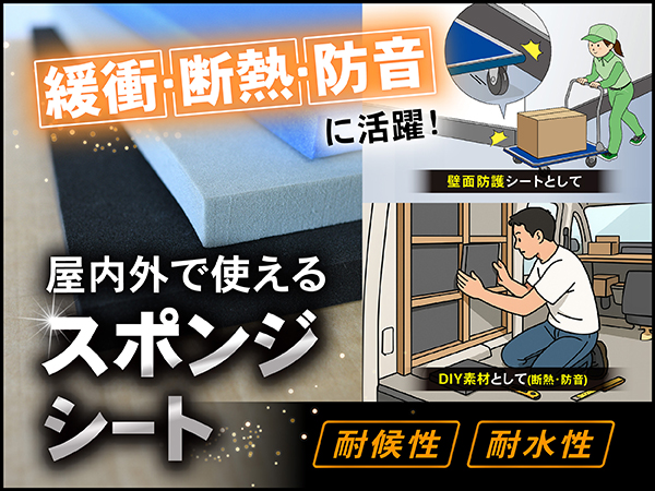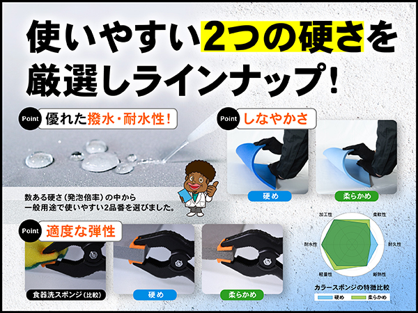 クッション性、断熱性、耐候性に優れたバランスの良いスポンジシートです。独立気泡タイプなので水に沈まない特性もあります。「硬め」は一般的な発泡スチロールより若干柔らかい程度、「柔らかめ」は一般的な消しゴムより若干柔らかい程度です。