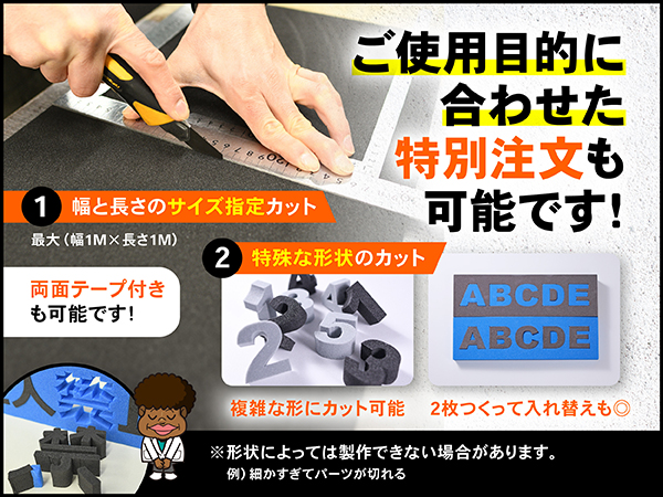 ゴム専門店が扱う軽くて使い勝手がよいスポンジです。ゴム同様にスポンジも非常に多くの種類がありますが、手頃な価格でどのような用途にも使いやすい材質を選びました。柔軟性、復元性に優れていることに加えて、吸水しないので拭き取るだけで清潔な状態を保つことができ、保育園や幼稚園などで安全かつ快適にお使いいただけます。また、1コからのオーダーカットが得意な私たちゴムシート.comでは「大きな青の5」などのように数字、アルファベット、文字を色違いサイズ違いで製作可能です。もちろんゴムと同じく緩衝材としても実用性があり、精密機器や工具箱の姿見管理の内装材にもご利用いただくことが多いです。ゴムでは実現できないソフトな感触をぜひお試しください。