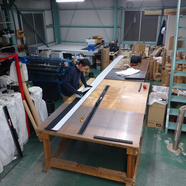 機械に載せられないサイズなので、作業台を使って手作業で貼りつけとカットをしています。広げられるスペースがあるので、テープの貼りつけ作業がしやすく、美しくできます。これが狭いところで広げながら巻きながらの作業になりますとミスがでやすく美しく仕上げにくいです。