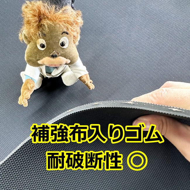 裂けにくい、破れにくい!補強布入りゴムは補強材であるナイロンメッシュをゴムで挟み込んだ構造になっています。補強材は全面に入っていますので、場所を問わず穴をあけて固定しても効果が得られる使い勝手が良い商品です。