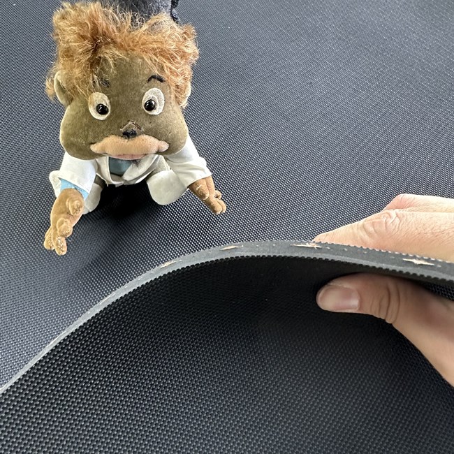 パッと見た感じは通常の天然ゴムシートと区別がつきません。しかし、断面をみると補強材が入っているのが分かります。この補強材が特殊な材質ではないのですが、ゴムの伸びを抑制して引きちぎれる、裂けるなどの不具合が起こりにくくなります。あくまで養生用でそれ以上の特性はないのですが、例えば、フラットバーで抑えてビス固定するなどの使い方では、ビス穴からゴムが裂けにくくなる効果が得られます。